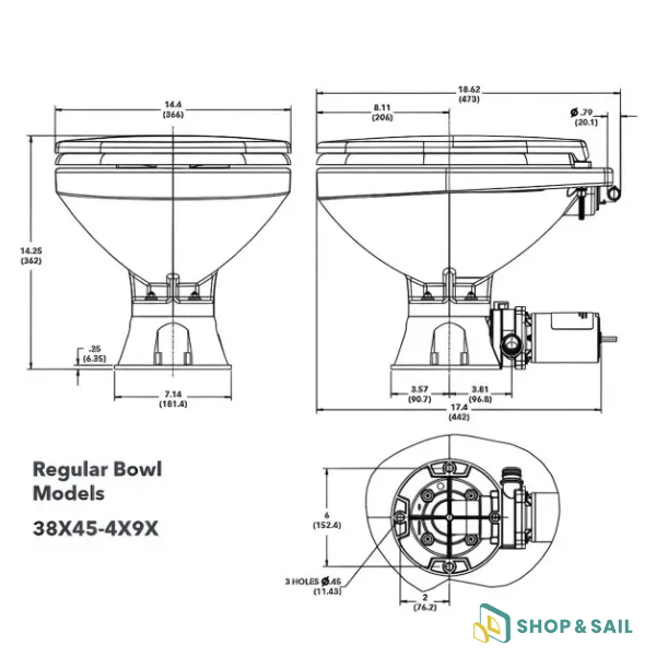 Spécifications techniques du Jabsco Quiet Flush E2 Regular avec pompe :