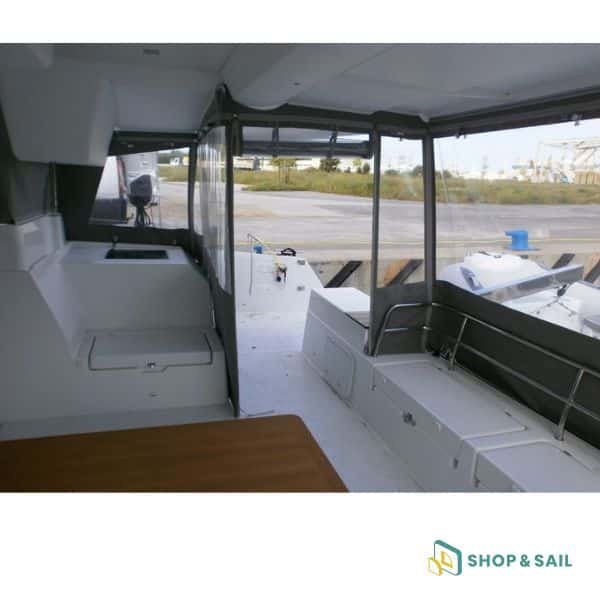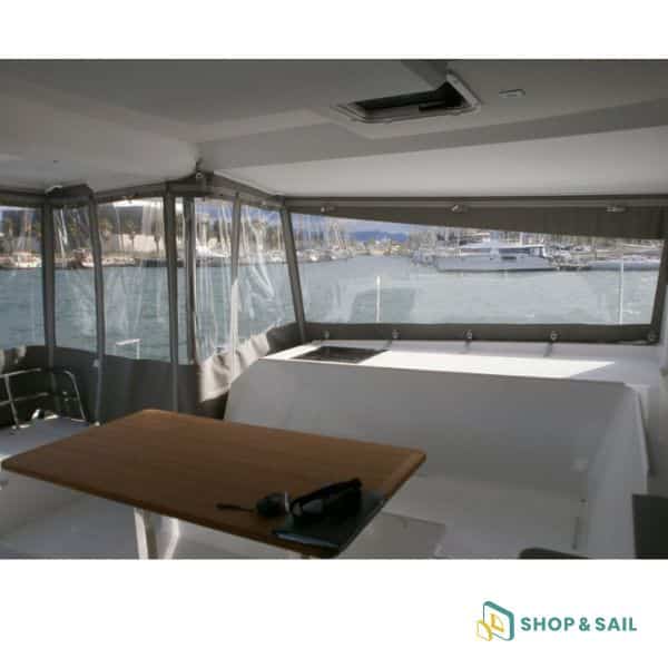 Toile de courtoisie conçue pour le catamaran Fountaine Pajot Saona 47, avec fermeture de descente intégrée. Elle permet de transformer le cockpit en un espace de vie protégé et confortable, idéal pour continuer à profiter du bateau même en cas d’intempéries.